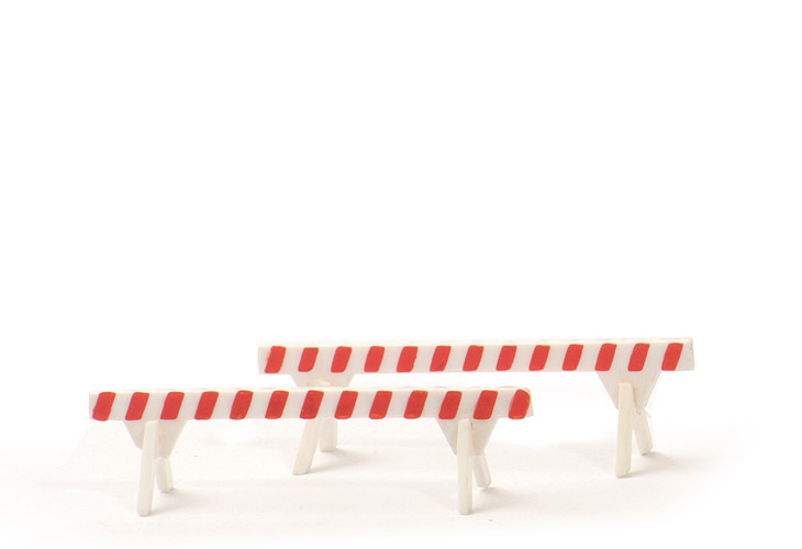 Die Absperrungen wurden nur als Bausatz geliefert: Mit lackierten Baken wie hier in Cellontüte (1956 - 1958) oder in Papiertüte (1959 - 1961) und später mit Aufklebern. Abbildung zusammengebaut ohne Verpackung.