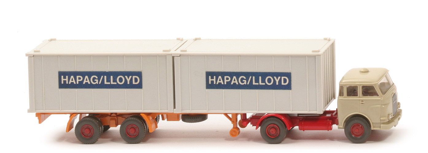 | | Zugmaschine | | Fahrerhaus | hellgelbgrau | | Verglasung | getönt | | Sitze | ca. silbergrau | | Kabinenboden | hellgelbgrau | | Chassis | rot | | Sattelpfanne | alt, mit Steg, für kleinen KöBo, aufgebohrt | | Fläche hinter Sattelpfanne | geriffelt | | Reserverad | ohne | | Räder | Profil grob | | Felgen | hellbraunrot | | | Container | | Typ | 2 x 20 ft, gerippt | | Farbe Dach | altweiß | | Farbe Korpus | altweiß | | Beschriftung | Hapag-Lloyd | | Beschriftung - Art | Papieraufkleber | | Beschriftung - Größe | 5 Felder | | | Auflieger | | Bolzen | stark | | Unterfahrschutz | ohne | | Farbe | gelborange (Werbe) | | Räder | Profil grob | | Felgen | hellbraunrot |
