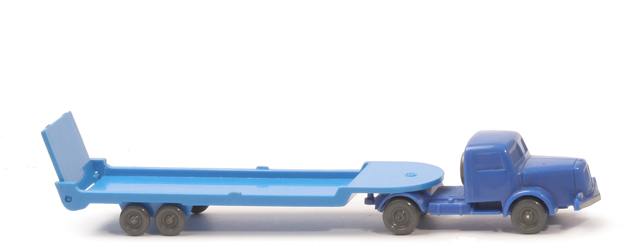 Achsen | Rollachser | | Zugmaschine | Farbe Kabine | ultramarin | Farbe Chassis | ultramarin | Bemalung | Scheinwerfer, Stoßstange | Sattelpfanne | eingesetzt, in Chassisfarbe | Chassis | Version 1a | Achshalterungen | geschlossen | Bodenprägung | WM (ohne Kreis) | Reserverad | hinter Kabine | Räder | 10 mm, o. Profil, dunkelbasaltgrau | | Auflieger | Achsen | Rollachser | Farbe | himmelblau | Typ | vorn rund (Typ 1) | Seilwinde | ohne | Fläche über Drehschemel | mit Prägung WM im Kreis | Rückleuchten | ohne | Rampe | kurz | Stützen | ohne | Bodenprägung | ohne | Königsbolzen | kurz | Räder | 7 mm, o. Profil, dunkelbasaltgrau |