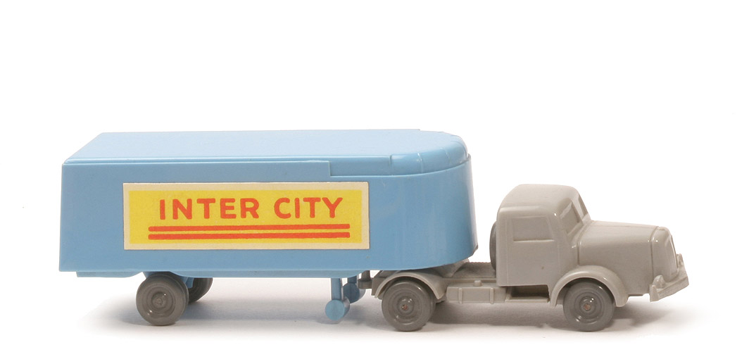 Achsen | Rollachser | | Zugmaschine | Farbe Kabine | dunkelsilbergrau | Farbe Chassis | dunkelsilbergrau | Bemalung | Scheinwerfer, Stoßstange | Sattelpfanne | eingesetzt, in Chassisfarbe | Chassis | Version 1a | Achshalterungen | geschlossen | Bodenprägung | WM im Kreis | Reserverad | hinter Kabine | Räder | 10mm, ohne Profil, ca. basaltgrau | | Auflieger | Farbe Oberteil | lilablau | Farbe Unterteil | lilablau | Radlauf | ohne Kotflügel | Bodenprägung | WM im Kreis | Rückleuchten | ohne | Dach | glänzend | Aufkleberart | Papier, matt | Beschriftung | Inter City (s. Foto) | Beschriftung Farbe | gelb mit roter Schrift | Räder | 10mm, ohne Profil, ca. basaltgrau |