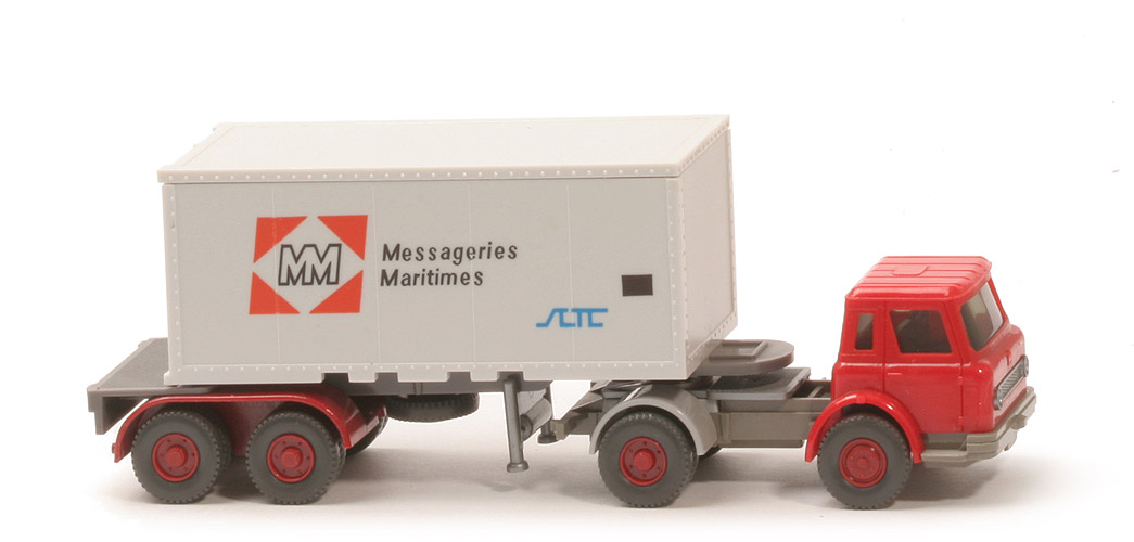 | | Zugmaschine | | Kabine | rot | | Lüfter | mit | | Inneneinrichtung | azurblau | | Verglasung | klar | | Chassis | betongrau | | Radlauf hinten | silbergrau | | Sattelpfanne | für großen Königsbolzen | | Reserverad | ohne | | Räder | Profil grob | | Felgen | hellbraunrot | | | Container | | Art | 20 ft Glattwand | | Farbe | altweiß | | Türen | alt | | Beschriftung | Messageries Maritimes (s. Foto) | | Beschriftung Art | Druck orangerot/schwarz/blau | | | Auflieger | | Farbe | basaltgrau | | Variante | mit Markierung, mit Bohrungen neben KoBo | | Reserverad | unter Auflieger, gesteckt | | Bodenprägung | 52h | | Doppelachsaggregat Farbe | hellbraunrot | | Doppelachsaggregat Typ | Klemmplatte WIKING u. GERMANY | | Hydraulikstützen | silbern, gesteckt | | Räder | Profil grob | | Felgen | hellbraunrot |