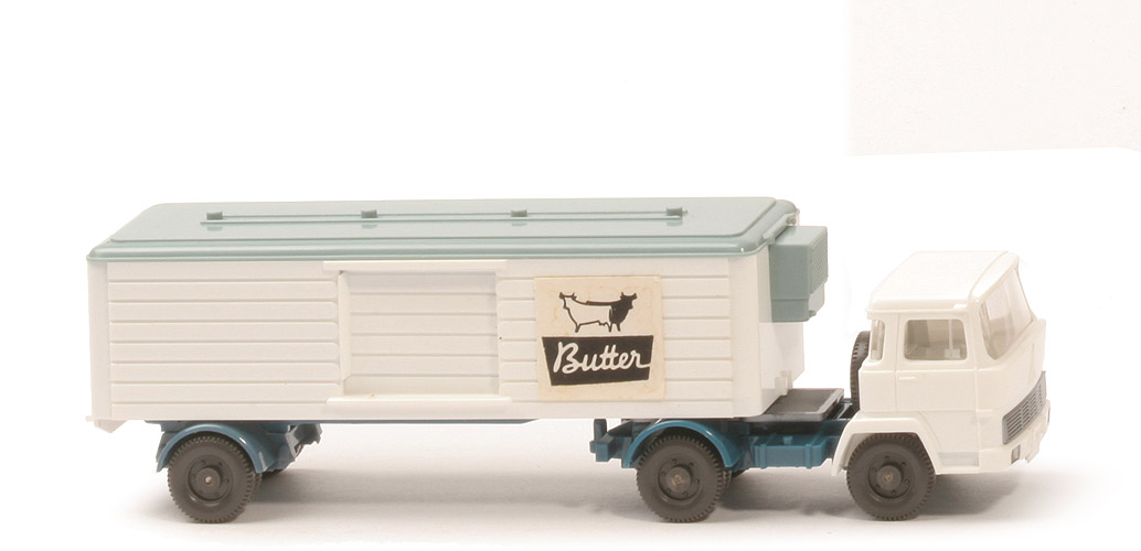 | Zugmaschine | Farbe Kabine | weiß | Verglasung | klar | Inneneinrichtung | ca. perlweiß | Grill | silbern eingesetzt | Farbe Chassis | azurblau | Bemalung | Scheinwerfer | Sattelpfanne | für großen KöBo | Radlauf hinten | azurblau | Bodenprägung | WM Germany | Reserverad | hinter Kabine | Räder | 11 mm, einteilig, Profil fein | | Auflieger | Dach | grünblau | Aufbau | weiß | Bodenprägung Aufbau | Wiking Modell, MiG, 52, Viking Model | Kühlaggregat | grünblau | Radlauf | mattgraublau | Achshalterungen | Typ 2 | Chassis | azurblau | Stützrollen | ohne | Königzapfen | stark, nach hinten versetzt | Bodenprägung Chassis | ohne | Beschriftung | beidseits Aufkleber "Butter", 16 x 15 mm | Räder | 11 mm, anthrazit, Profil fein |