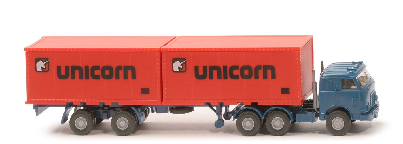 | | Zugmaschine | | Kabine | capriblau | | Kabinen-Unterteil | capriblau | | Verglasung | klar | | Inneneinrichtung | ca. hellolivgrau | | Auspuffrohre | 2, silber | | Chassis | capriblau | | Radlauf hinten | capriblau | | Sattelpfanne | für großen Königsbolzen | | Reserverad | ohne | | Räder | Profil grob | | Felgen | silbergrau | | | Container | | Art | Glattwand | | Farbe | dunkelleuchtorange | | Türen | alt | | Beschriftung | Unicorn (s. Foto) | | Beschriftung Art | Druck | | | Auflieger | | Farbe | capriblau | | Unterfahrschutz | ohne | | Königsbolzen | stark | | Räder | Profil grob | | Felgen | silbergrau |