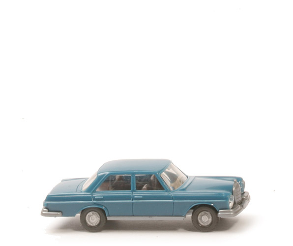 Farbe Karosserie | azurblau | Scheinwerfer | klar, eingeklebt | Fläche hinter Scheinwerfern | nicht bemalt | Grill | silbern, eingesetzt, mit Stern | Inneneinrichtung | ca. lichtgrau | Lenkrad | separat eingesetzt, ca. perlweiß | Chassis Farbe | silbern | Bodenprägung | Mercedes 280 S, WIKING Germany, 15 s | Bemalung Rückleuchten | ohne | Räder | Riffelkappe gesilbert |