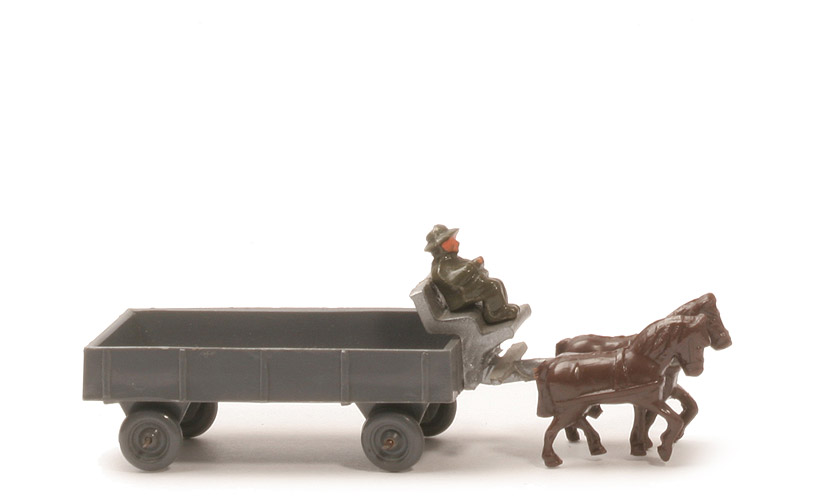 Räder | Drahtachser | Pritschentyp | ohne Querverbretterung | Farbe Pritsche | basaltgrau | Deichselrest | ohne | Pritschenboden | mit Struktur | Zughaken | ohne | Deichsel/Kutschbock | silbern | Quersteg Deichsel | mit | Farbe linkes Pferd | ca. schokobraun | Farbe rechtes Pferd | ca. schokobraun | Kutscher Typ | Hut | Kutscher Farbe | olivgrün uni | Kutscher Bemalung | Gesicht, Hände | Räder | ca. basaltgrau |
