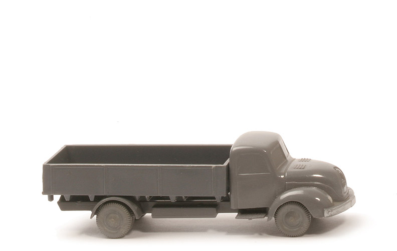 Achsen | Rollachser | Version Kabine | Typ 1a | Kabine unten | mit Bohrungen | Farbe Kabine u. Chassis | basaltgrau | Verstärkung Trittbretter | mit | Bemalung Kabine | Scheinwerfer, Stoßstange | Chassis Farbe | basaltgrau | Version Chassis | Version 1b | Bodenprägung | WM im Kreis | Pritsche | Seiten glatt | Farbe Pritsche | dunkelbasaltgrau | Zughaken | nach unten | Zapfen | Flachzapfen | Kennzeichen | bemalt silbern | Befestigung Pritsche | geklebt | Räder | 10mm, mit Profil |