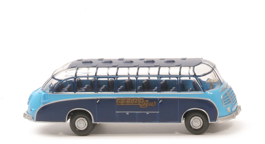 Auf der Seite wurde reaktivierte "Setra"-Schriftzug in ca. goldmetallic verklebt. Dies erinnert an die Werbemodelle des Setra. Seitlich wurden die Türgriffe, Gepäckklappengriffe und die Farbabsetzung umrandende Zierliene silbern bedruckt. Erstmals sind bei dieser Ausführung die Fensterrahmen farblich abgesetzt. |