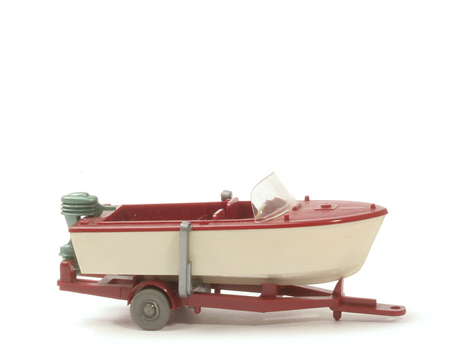 | | Boot | | Bootoberseite | rotbraun | | Vordersitze | ohne Verbindungssteg | | Windschutzscheibe | groß (ca. 7 mm hoch) | | Lenkrad | ca. hellelfenbein, 3-speichig | | Fußraum (Deck) | silbern | | hier Prägung | WM | | Außenborder | grünmetallic | | Rumpf | weiß, leicht vergilbt | | | Anhänger | | Farbe | braunrot | | Version | Typ 1 (mit zwei runden Stiften) | | Nestkennung | "3" | | Bodenprägung | Wiking Germany | | Befestigung Boot | Kunststoffklammer silber | | Räder | basaltgrau, Nabe gewölbt |