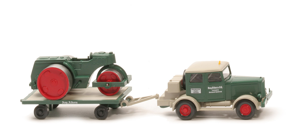 Hübsches Modell zur Intermodellbau 20. - 24. April 2016. Die Zugmaschine trägt seitlich den Druck "Aug.Alborn K-G. - Transporte Dortmund-Hombruch" und ein Standortschild "Güternahverkehr