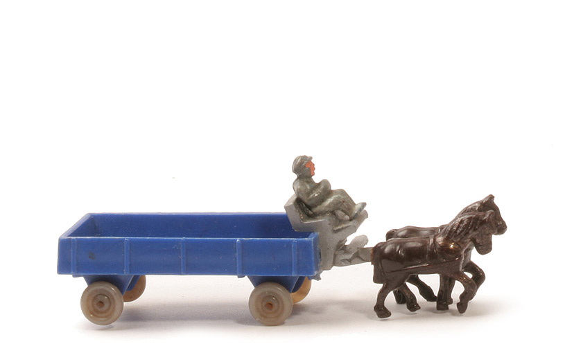 | Räder | Drahtachser | | Pritschentyp | ohne Querverbretterung | | Farbe Pritsche | ultramarin | | Deichselrest | mit | | Pritschenboden | glatt | | Zughaken | ohne | | Deichsel/Kutschbock | silbern | | Quersteg Deichsel | mit | | Farbe linkes Pferd | schokobraun | | Farbe rechtes Pferd | schokobraun | | Kutscher Typ | Mütze | | Kutscher Farbe | ca. blaugrau | | Kutscher Bemalung | Gesicht, Hände | | Räder | sehr glasig |