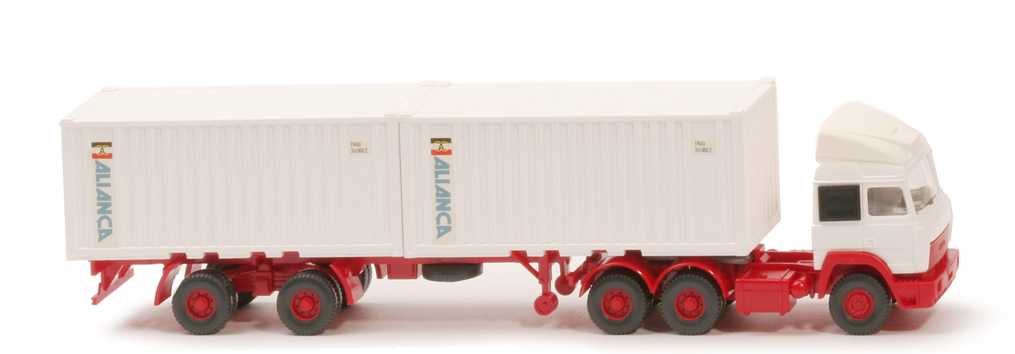 | | Zugmaschine | | Kabine, Dachspoiler | weiß | | Verglasung | klar | | hintere seitl. Kabinenfenster | schwarz geschlossen | | Inneneinrichtung | ca. silbergrau, Lkr integriert | | Reserverad | ohne | | Stoßstange, Grill | rot | | Ansaugstutzen | rot | | Chassis | rot | | Bodenprägung Chassis | neues WIKING-Logo, Berlin-W, Germany | | Radlauf hinten | zweiteilig rot | | Räder | Profil grob | | Felgen | 8-Loch-Felgen, rot | | | Container | | Art | 2 x 20 ft Stahlcontainer mit Aussparung | | Farbe | weiß (!) | | Türen | für Stahlcontainer | | Beschriftung | Alianca, Cont.-Nr. (s. Foto) | | Beschriftung Art | Druck auf weißem Haftetikett | | | Auflieger | | Farbe | rot | | Unterfahrschutz | mit | | Rückstrahler | am Unterfahrschutz | | Königsbolzen | stark | | Räder | Profil grob | | Felgen | 8-Loch-Felgen, rot |