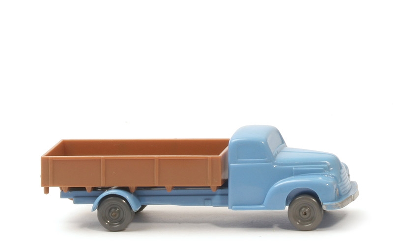 | Achsen | Rollachser | | Farbe Kabine u. Chassis | lilablau | | Kabinenboden | offen, WM im Kreis | | Bemalung Kabine | Scheinwerfer, Stoßstange | | Pritsche | Seiten glatt | | Farbe Pritsche | ockerbraun | | Zughaken | nach unten | | Zapfen | Rundzapfen | | Befestigung Pritsche | nur gesteckt | | Räder | 10mm, ohne Profil |