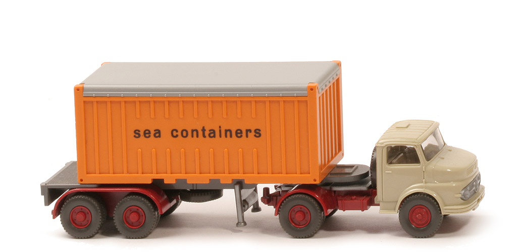 | Zugmaschine | Kabine | hellgelbgrau | Lüfter | mit | Eckfenster | mit | Blinker | auf Kotflügel | Inneneinrichtung | ca. olivgrau | Verglasung | klar | Chassis | hellbraunrot | Radlauf hinten | hellbraunrot | Sattelpfanne | für großen Königsbolzen | Reserverad | hinter Kabine | Räder | Profil grob | Felgen | hellbraunrot | | Container | Art | Open Top | Dach | silbergrau | Korpus | gelborange | Beschriftung | sea containers ... (s. Foto) | Beschriftung Art | Druck | | Auflieger | Farbe | basaltgrau | Variante | mit Markierung, BP 52 h | DAA Farbe | hellbraunrot | Achshalterung | Klemmplatte | Königsbolzen | stark | Räder | Profil grob | Felgen | hellbraunrot |