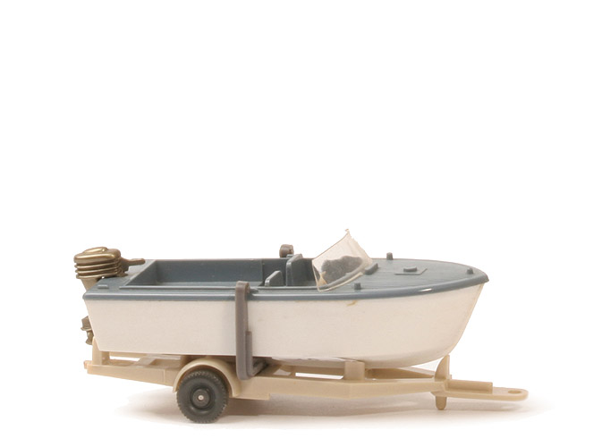 | | Boot | | Bootoberseite | graublau | | Vordersitze | mit Verbindungssteg mit Nippel | | Windschutzscheibe | flach (ca. 6 mm hoch) | | Lenkrad | ca. hellelfenbein, 3-speichig | | Fußraum (Deck) | silbern | | hier Prägung | WM | | Außenborder | goldmetallic | | Rumpf | altweiß | | | Anhänger | | Farbe | ca. hellelfenbein | | Version | Typ 2 (mit Schlitz für Kunststoffhalterung) | | Nestkennung | "2" | | Bodenprägung | Wiking Germany | | Befestigung Boot | per Kunststoffhalterung - basaltgrau | | Räder | anthrazit, Nabe glatt |