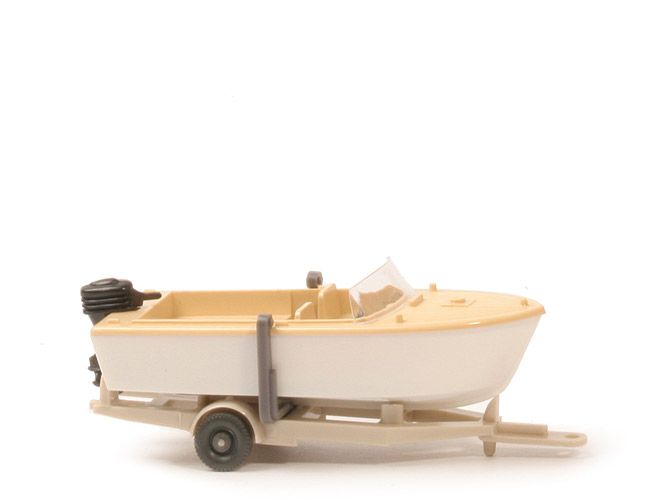 | | Boot | | Bootoberseite | hellbeige | | Vordersitze | mit Verbindungssteg mit Nippel | | Windschutzscheibe | flach (ca. 6 mm hoch) | | Lenkrad | schwarz, 3-speichig | | Fußraum (Deck) | silbern | | hier Prägung | WM | | Außenborder | schwarz | | Rumpf | weiß | | | Anhänger | | Farbe | ca. hellelfenbein | | Version | Typ 2 (mit Schlitz für Kunststoffhalterung) | | Nestkennung | "1" | | Bodenprägung | Wiking Germany | | Befestigung Boot | per Kunststoffhalterung - ca. basaltgrau | | Räder | anthrazit, Nabe glatt |