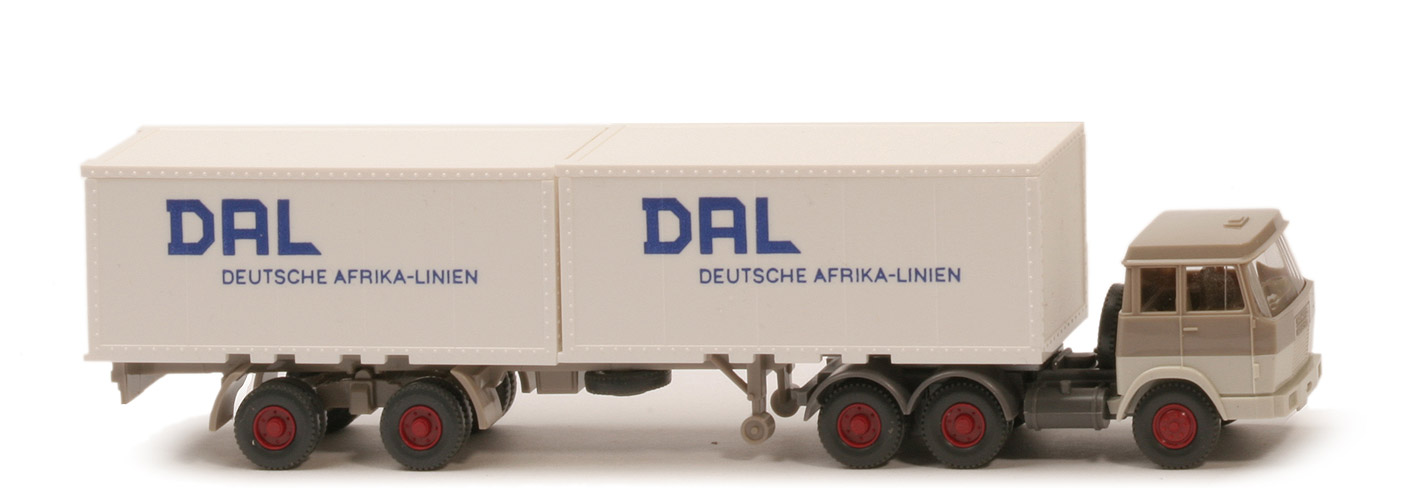 | | Zugmaschine | | Kabine oben | graubeige | | Kabine unten | altweiß | | Verglasung | klar | | Inneneinrichtung | ca. graubeige | | Lenkrad | mit | | Chassis | basaltgrau | | Radlauf hinten | basaltgrau, 2-teilig | | Sattelpfanne | für großen Königsbolzen | | Reserverad | hinter Kabine | | Räder | Profil grob | | Felgen | hellbraunrot | | | Container | | Art | 2 x 20 ft neu | | Farbe | weiß | | Türen | alt | | Beschriftung | DAL OHNE Nummer (s. Foto) | | Beschriftung Art | Druck ca. stahlblau | | | Auflieger | | Farbe | graubeige | | Unterfahrschutz | ohne | | Königsbolzen | stark | | Räder | Profil grob | | Felgen | hellbraunrot |