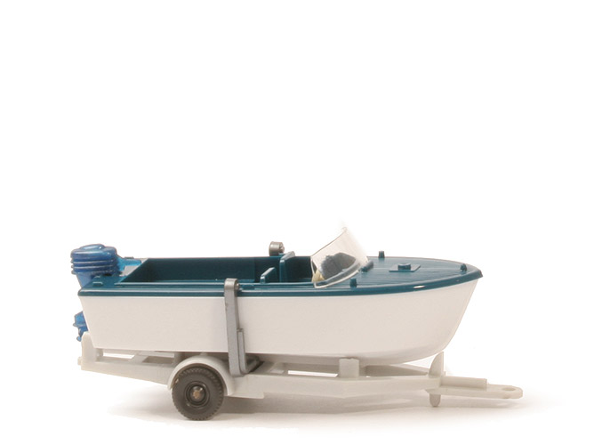| | Boot | | Bootoberseite | ozeanblau | | Vordersitze | ohne Verbindungssteg | | Windschutzscheibe | flach (ca. 6 mm hoch) | | Lenkrad | ca. hellelfenbein, 3-speichig | | Fußraum (Deck) | silbern | | hier Prägung | WM | | Außenborder | blaumetallic | | Rumpf | weiß | | | Anhänger | | Farbe | altweiß | | Version | Typ 2 (mit Schlitz für Kunststoffhalterung) | | Nestkennung | "2" | | Bodenprägung | Wiking Germany | | Befestigung Boot | per Kunststoffhalterung - silbern | | Räder | anthrazit, Nabe flach |