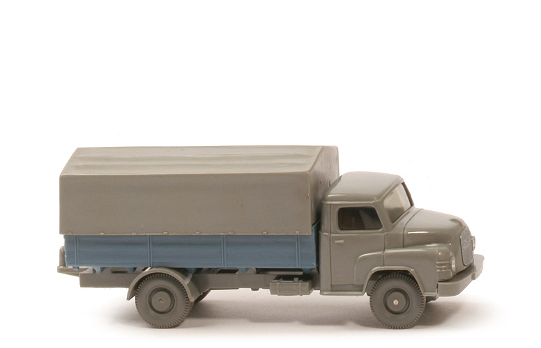 | Modellversion | Typ 1 - Chassis alt, Pritsche alt | | Farbe Kabine | betongrau | | Verglasung | getönt | | Grill | silbern eingesetzt | | Bemalung | nur Scheinwerfer | | Inneneinrichtung | ohne | | Haltenasen Kabine | ohne | | Chassis Art | Typ 1 | | Bodenprägung | nur WM | | Bereich Kardan hinten | offen | | Rücklichtstange | ohne | | Pritschenabstützung | punktuell | | Arretierung Haltenasen | ohne | | Chassisfarbe | betongrau | | Pritsche Art | Normpritsche | | Pritschenseiten | waagerechte Gravuren | | Farbe Pritsche | mattgraublau | | Rückleuchten | eingerückt | | Kennzeichen | zweiteilig | | Pritscheneinlage | ohne | | Bemalung Rückleuchten | rot | | Bemalung Kennzeichen | ohne | | Plane | ca. betongrau | | Räder | 11mm, glatt |