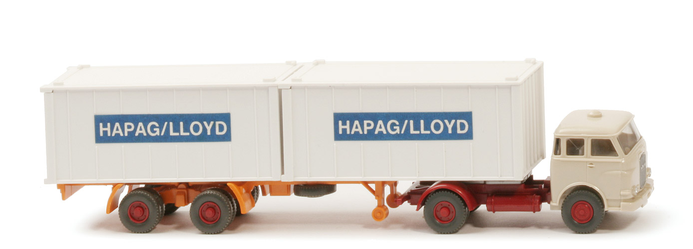 | Zugmaschine | Fahrerhaus | hellelfenbein | Verglasung | getönt | Sitze | ca. silbergrau | Kabinenboden | hellelfenbein | Chassis | hellbraunrot | Sattelpfanne | für großen Königsbolzen | Fläche hinter Sattelpfanne | 3 Stege | Reserverad | ohne, vorgesehen u. CH | Räder | Profil grob | Felgen | hellbraunrot | | Container | Typ | 2 x 20 ft, gerippt | Farbe Dach | reinweiß | Farbe Korpus | reinweiß | Beschriftung | Hapag-Lloyd | Beschriftung - Art | Papieraufkleber | Beschriftung - Grösse | 5 Felder | | Auflieger | Bolzen | stark | Unterfahrschutz | ohne | Farbe | gelborange (Werbe) | Räder | Profil grob | Felgen | hellbraunrot |