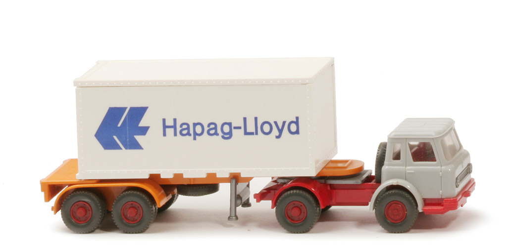 | Zugmaschine | Kabine | silbergrau | Lüfter | mit | Inneneinrichtung | rot | Verglasung | klar | Chassis | rot | Radlauf hinten | rot | Sattelpfanne | für großen Königsbolzen | Reserverad | hinter Kabine | Räder | Profil grob | Felgen | hellbraunrot | | Container | Art | 20 ft Glattwand | Farbe | weiß | Türen | alt | Beschriftung | Hapag-Lloyd (s. Foto) | Beschriftung Art | 38mm, ohne Nummer | | Auflieger | Farbe | gelborange | Variante | mit Markierung | Achseinheit Farbe | gelborange | Achshalterung | Klemmplatte | Königsbolzen | stark | Räder | Profil grob | Felgen | hellbraunrot |