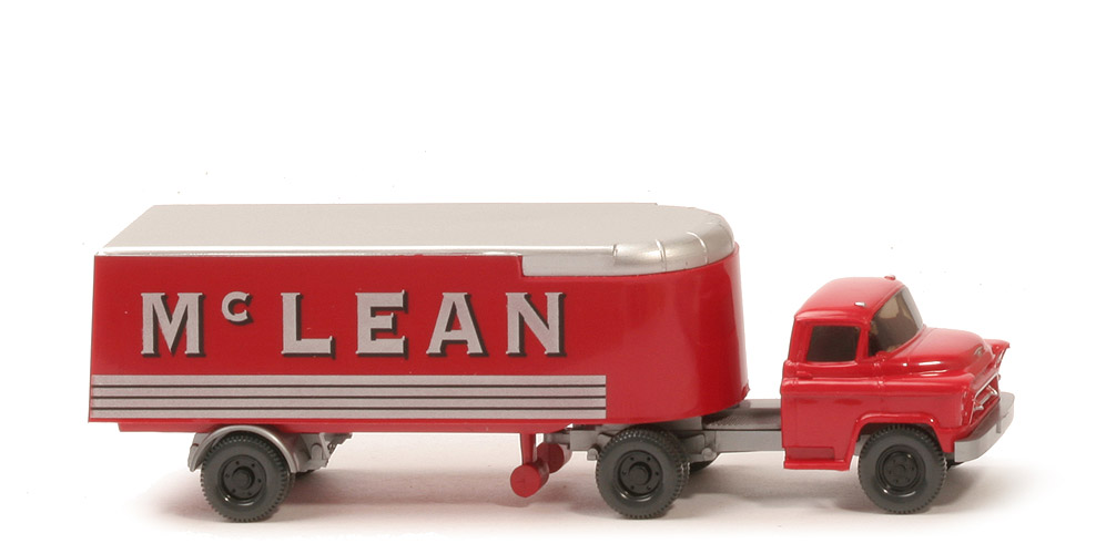 | Zugmaschine | Farbe Kabine | ca. rubinrot | Farbe Chassis | silbern | Sattelpfanne | alt, mit Steg, für großen KöBo, ähnlich: | Bodenprägung | neues WIKING-Logo, Germany | Zughaken | mit | Räder | 11 mm, Felgen eingesetzt | Felgen | 6-Loch schwarz | | Auflieger | Farbe Oberteil | ca. rubinrot | Farbe Unterteil | ca. rubinrot | Radlauf | mit Kotflügel silber | Bodenprägung | neues WIKING-Logo | Rückleuchten | mit | Stützen | ca. rubinrot | Dach | mattiert, gesilbert | Beschriftung | McLean (... s. Foto) | Räder | 11 mm, Felgen eingesetzt | Felgen | 6-Loch schwarz |