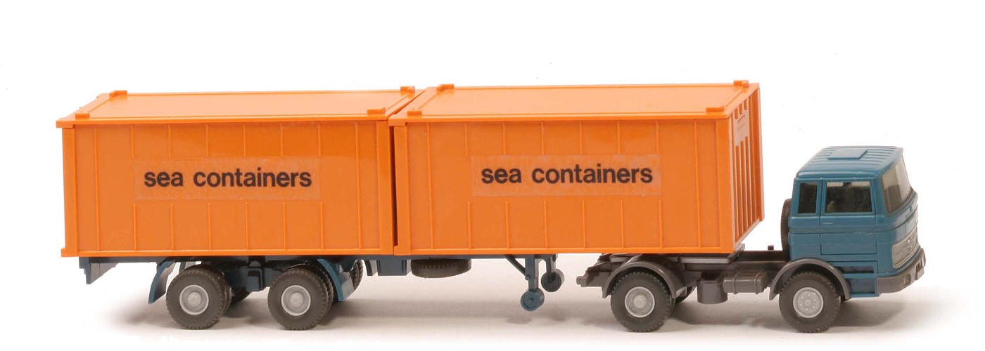 | Zugmaschine | Kabine oben | azurblau | Kabine unten | azurblau | Streifen | ohne | Verglasung | getönt | Inneneinrichtung | ca. hellgelbgrau | Lenkrad | ohne | Grill | silbern | Stoßstange, Radlauf vorn | basaltgrau | Chassistyp | neu | Chassisfarbe | basaltgrau | Radlauf hinten | basaltgrau | Reserverad | hinter Kabine | Sattelpfanne | für großen Königsbolzen | Räder | 12mm, Profil grob | Felgen | silbergrau | | Container | Art | 2 x 20 ft gerippt | Dach | gelborange | Korpus | gelborange | Türen | gelborange | Unterkante | schmal | Beschriftung | Sea Containers (s. Foto) | Beschriftung Art | Folie | | Auflieger | Farbe | ozeanblau | Unterfahrschutz | ohne | Königsbolzen | stark | Räder | 12mm, Profil grob | Felgen | silbergrau |