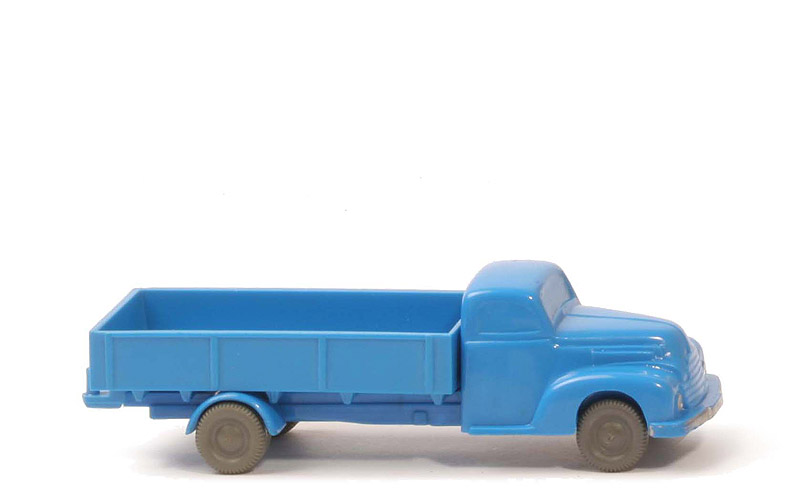 | Achsen | Rollachser | | Farbe Kabine u. Chassis | himmelblau | | Kabinenboden | geschlossen | | Bodenplatte Prägung | WM im Kreis | | Bemalung Kabine | Scheinwerfer, Stoßstange | | Pritsche | Seiten glatt | | Farbe Pritsche | himmelblau | | Zughaken | nach oben | | Zapfen | Flachzapfen | | Befestigung Pritsche | geklebt | | Räder | 10mm, mit Profil |