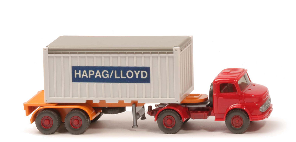 MB 1413 nicht als Hapag-Lloyd Werbemodell im GK. Jedoch mehrfach belegt. Hier Kabine rot, Auflieger gelborange, Container altweiß.