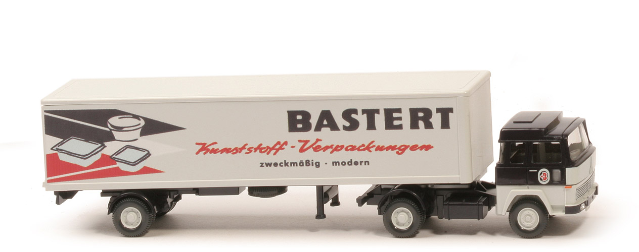 | | Zugmaschine | | Kabine oben | "schwarzblau" | | Kabine unten | ca. altweiß | | Verglasung | klar | | Inneneinrichtung | ca. lichtgrau, Lkr integriert | | Grill | "schwarzblau", ca. altweiß bedruckt | | Bedruckung der Kabine | umfänglich (s. Foto) | | Chassis | 2-achsig | | Bodenprägung | altes und neues WIKING-Logo (!) | | Radlauf hinten | "schwarzblau" | | Sattelpfanne | für großen Königsbolzen, mit Grill, ähnlich | | Reserverad | ohne | | | Auflieger | | Kofferdach | ca. altweiß | | Koffer Korpus | ca. altweiß | | Türen | ca. altweiß | | Chassis Typ | skelletiert - für Steckbauweise, aber geklebt | | Chassis Farbe | "schwarzblau" | | Bodenprägung | neues WIKING-Logo | | Einachsaggregat Farbe | "schwarzblau" | | Stützen | "schwarzblau" | | Beschriftung | Bastert ... (s. Bild) | | | Räder | | Räder Typ | 11 mm, Felgen eingesetzt | | Felgen | 8-Loch, ca. altweiß |