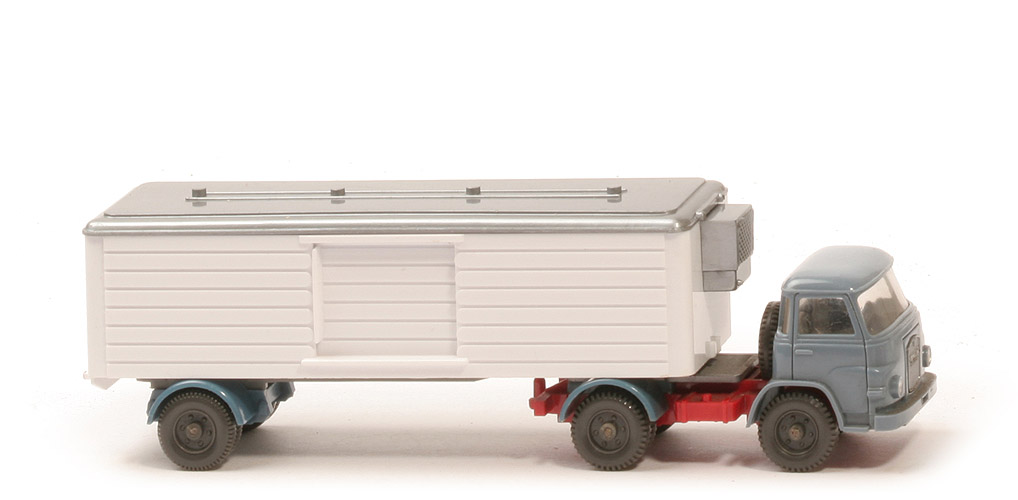 | Zugmaschine | Farbe Kabine | graublau | Verglasung | klar | Inneneinrichtung | ca. lichtgrau | Grill | silbern eingesetzt | Bemalung | Scheinwerfer | Farbe Chassis | rot | Chassisplatte | blaugrau (!) | Sattelpfanne | für kleinen KöBo | Radlauf hinten | mattgraublau | Bodenprägung | WM Germany | Reserverad | hinter Kabine (Profil grob) | Räder | 11 mm, einteilig, Profil grob | | Auflieger | Dach | silbern | Aufbau | weiß | Bodenprägung Aufbau | Wiking Modell, MiG, 52, Viking Model | Kühlaggregat | silbern | Radlauf | mattgraublau | Achshalterungen | Typ 2 | Chassis | basaltgrau | Stützrollen | ohne | Königzapfen | integriert, nach hinten versetzt | Bodenprägung Chassis | ohne | Räder | 11 mm, anthrazit, Profil fein |