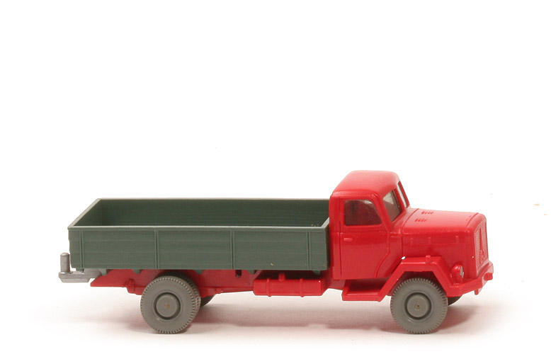 Farbe Kabine | rot | Verglasung | getönt | Bemalung vorn | Scheinwerfer silber | Chassis Farbe | rot | Chassis Art | Version 4 | hinterer Chassisbereich | geschlossen | Chassis Bodenprägung | WM, Germany | Pritsche Art | Normpritsche | Pritschenseiten | waagerechte Gravuren | Rückleuchten | bündig an Rückwand | Kennzeichen | einteilig | Pritsche Farbe | graugrün | Pritscheneinlage | silbern | Bemalung Rückleuchten | rot | Bemalung Kennzeichen | ohne | Zughaken | silbern, eingesetzt | Räder | 11mm, glatt, hellgrau |