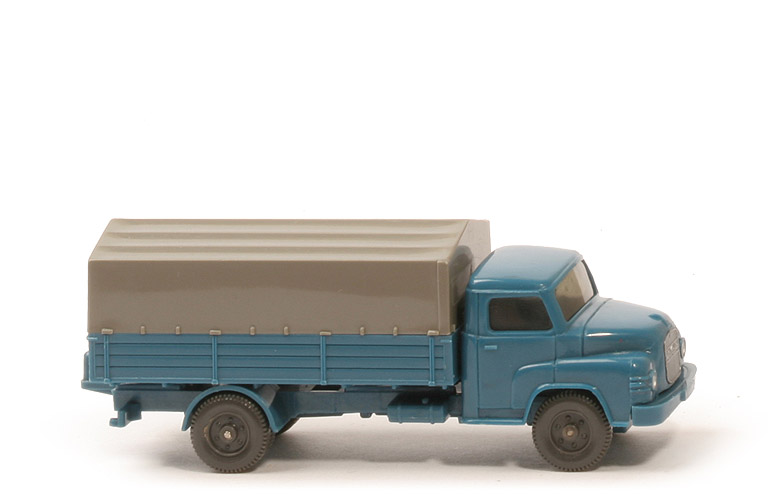 Modellversion | Typ 3 - Chassis neu, Pritsche neu | Farbe Kabine | azurblau | Verglasung | getönt | Grill | silbern eingesetzt | Bemalung | nur Scheinwerfer | Inneneinrichtung | glatte Bank | Haltenasen Kabine | mit | Chassis Art | Typ 3 | Bodenprägung | WM, GERMANY, 41 | Bereich Kardan hinten | geschlossen | Rücklichtstange | mit | Pritschenabstützung | Stege | Arretierung Haltenasen | mit | Chassisfarbe | azurblau | Pritsche Art | fein strukturiert | Pritschenseiten | gerade, feine Struktur | Pritschenunterseite | 6 schmale Quertraversen | Pritsche Farbe | azurblau | Pritscheneinlage | silbern | Bemalung Rückleuchten | ohne | Plane | ca. felsgrau | Räder | 6-Loch, Profil fein |