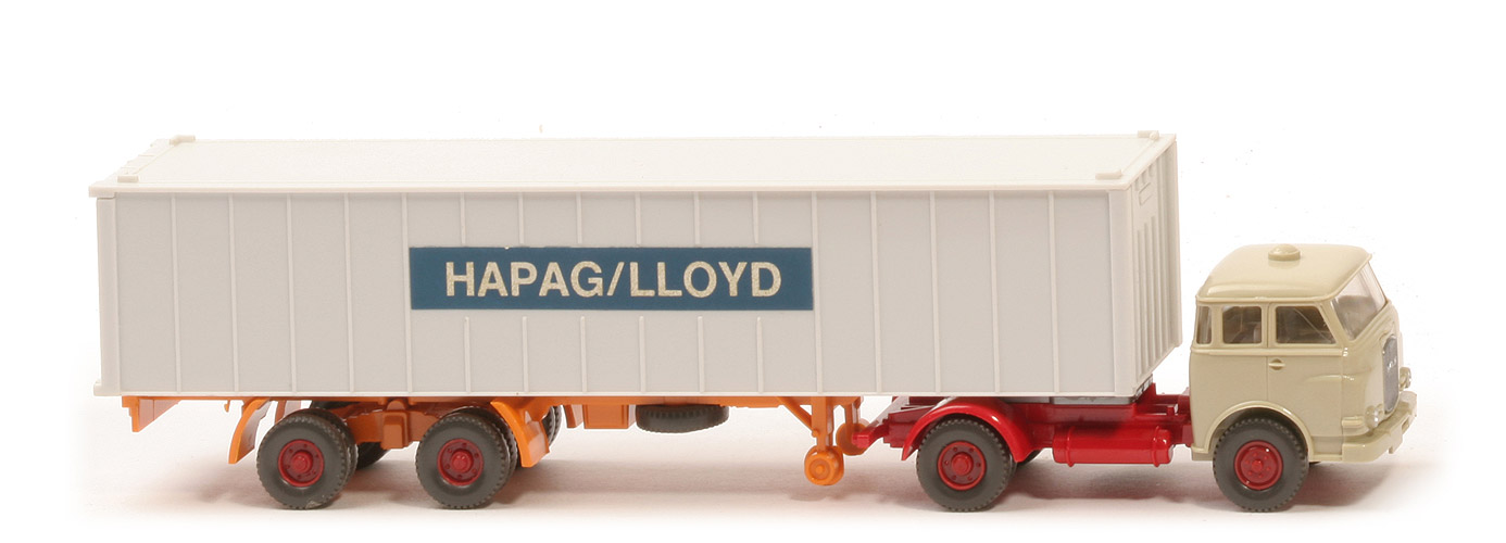 | Zugmaschine | Fahrerhaus | hellgelbgrau | Verglasung | klar | Sitze | ca. lichtgrau | Kabinenboden | hellgelbgrau | Chassis | rot | Sattelpfanne | für großen Königsbolzen | Fläche hinter Sattelpfanne | 3 Stege | Reserverad | unter Chassis gesteckt | Räder | Profil grob | Felgen | hellbraunrot | | Container | Typ | 1 x 40 ft, gerippt | Farbe Dach | altweiß | Farbe Korpus | altweiß | Beschriftung | Hapag-Lloyd | Beschriftung - Art | Papieraufkleber | Beschriftung - Grösse | 7 Felder | untere Kante | schmal | | Auflieger | Bolzen | stark | Unterfahrschutz | ohne | Farbe | gelborange (Werbe) | Räder | Profil grob | Felgen | hellbraunrot |