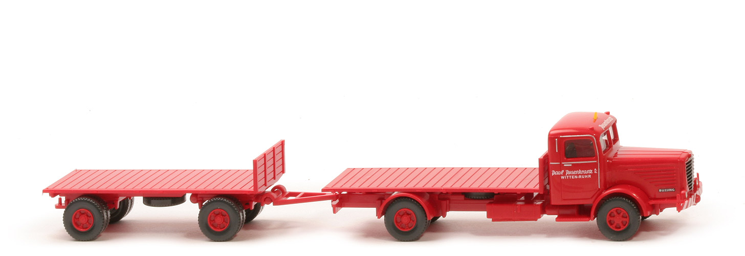 Die Kabine ist wirklich sehr schön bedruckt: "Paul Rosenkranz A.G. WITTEN-RUHR" auf den Türen, "Rosenkranz" am Dach frontseitig, die vordere Stoßstange trägt Warnbaken und unten an der Motorhaube gibt es den BÜSSING-Schriftzug in silbern auf schwarz. Auch die Zierleisten und Türgriffe sind silbern bedruckt. Die Pritschen von Zugwagen und Anhänger sind völlig verschiedene Bauteile. Die Farbangabe "karminrot" findet sich nicht in der Farbkarte von Holger Wanner. |