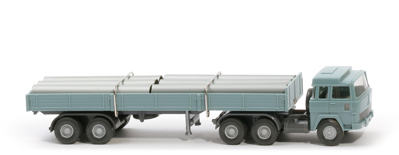 | Zugmaschine | Kabine oben | grünblau | Kabine unten | grünblau | Verglasung | klar | Inneneinrichtung | ca. lichtgrau | Lenkrad | ohne | Grill | silber | Chassis | anthrazit | Radlauf hinten | anthrazit, 1-teilig | Sattelpfanne | für den dünnen Königszapfen | Reserverad | hinter Kabine | Räder | Profil fein | Felgen | silbergrau | | Auflieger | Farbe Pritsche | grünblau | Pritschentyp | Pritsche mit niedriger Stirnseite | Chassis | basaltgrau | Königsbolzen | dünn | Pritscheneinlage | silbern, nicht verklebt, nur Hälfte der Pritsche | Doppelachsaggregat | Klemmplatte | Doppelachsaggregat Farbe | anthrazit | Bodenprägung Achseinheit | Germany, Wiking | Reserverad | ja | Stütze | starr, silbern, Hydraulikstempel | Ladung | 2x3 Röhren | Räder | Profil fein | Felgen | silbergrau |