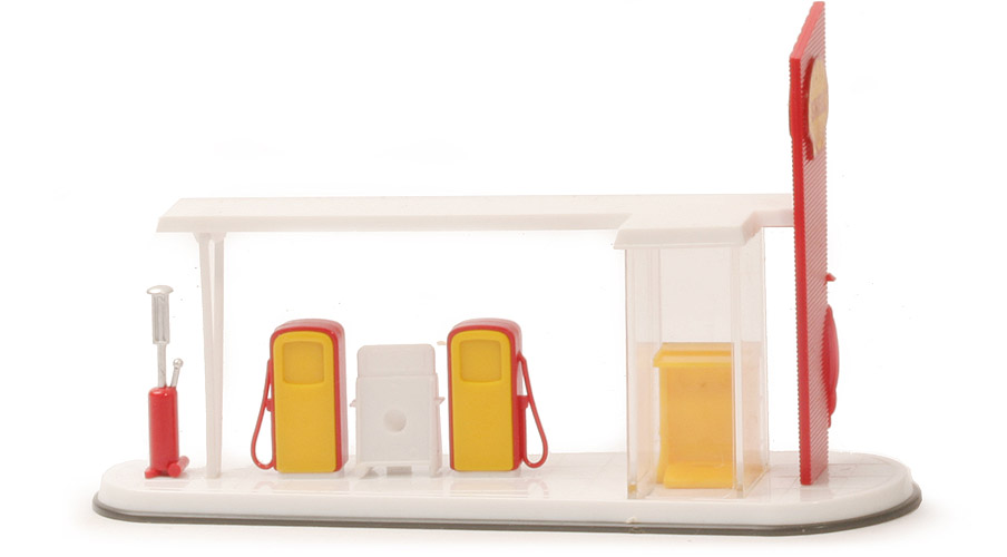 Dach | weiß | Verkaufsraum | klar verglast | hier Tresen | gelb, mit Öldosen-Auslagen | Bemalung Tresen | Zierkanten silbern | Zapfsäulen Umrandung | rot | Zapfsäulen Korpus | gelb | Werbeaufsteller zw. Zapfsäulen | weiß | Zweitakt-Säule | rot, Pumpmechnismus gesilbert | Boden | weiß, Kachel-Struktur | Bodenplatte | dunkelbasaltgrau | hier Bodenprägung | WIKING, 81 s, Germany | seitliche Werbewand | rot | hier Werbeaufkleber | "Shell", Papier bedruckt |