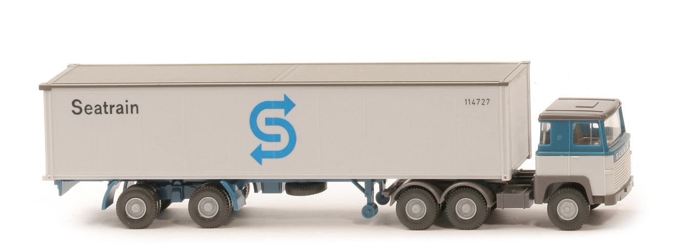 | Zugmaschine | Dach | basaltgrau | Kabine oben | azurblau | Kabine unten | altweiß | Stoßstange | basaltgrau | Frontbeschriftung | SCANIA breit | hier Farbhinterlegung | azurblau | Grill Prägung | mit 110 | Scheinwerfer | in der Stoßstange gesilbert | Spiegel | ohne | Scheibenwischer | ohne | Lenkrad | ohne | Sattelpfanne | für großen Königsbolzen | Reserverad | ohne | Chassis Farbe | basaltgrau | Räder | 12mm, Profil grob | Felgen | silbergrau | | Container | Art | 40 ft Glattwand | Dach | ca. umbragrau | Korpus | altweiß | Türen | neu, altweiß | Beschriftung | Seatrain ... (s. Foto) | Pfeile | ca. himmelblau | | Auflieger | Farbe | azurblau | Unterfahrschutz | ohne | Königsbolzen | stark | Räder | 12mm, Profil grob | Felgen | silbergrau |