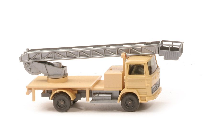Kabine | hellbeige ~ | Spiegel | ohne | Grill | silbern mit Stern | Verglasung | stark getönt | Inneneinrichtung | ca. hellgelbgrau | Lenkrad | ohne | Chassis | staubgrau | Druckluftbehälter | Hahn breit | Bodenprägung | GERMANY, WM | Radlauf hinten | hellbeige | Aufbau | hellbeige | Bemalung Arbeitsleuchten | rot | Warnbake Heck | rot/weiß, Papieraufkleber matt | Trittbretter | silbern | Drehschemel | silbern | Leiter | silbern, 2-zugig, 1 Stift | Korb | silbern | Räder | 11mm, 6 Loch, anthrazit |