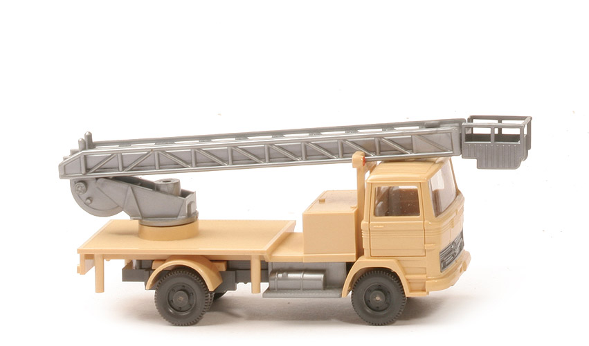 Kabine | hellbeige ~ | Spiegel | ohne | Grill | silbern mit Stern | Verglasung | klar (!) | Inneneinrichtung | ca. silbergrau | Lenkrad | ohne | Chassis | staubgrau | Druckluftbehälter | Hahn breit | Bodenprägung | GERMANY, WM | Radlauf hinten | hellbeige | Aufbau | hellbeige | Bemalung Arbeitsleuchten | rot | Warnbake Heck | rot/weiß, Papieraufkleber matt | Trittbretter | silbern | Drehschemel | silbern | Leiter | silbern, 2-zugig, 2 Stifte | Korb | silbern | Räder | 11mm, 6 Loch, anthrazit |