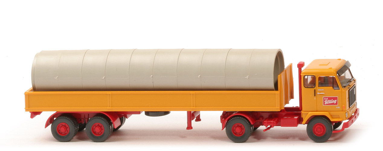 | Zugmaschine | Kabine oben | "narzissengelb" | Sonnenblende | rauchtransparent | Luftansaugstutzen | "karminrot" | Verglasung | klar | Inneneinrichtung | "zeltgrau" | eingesetzter Grill | schmal, schwarz, Rand, Logo silbern bedruckt | Bedruckung Front | "Volvo", Scheinwerfer silbern | Bedruckung Türen | Emil Bölling | Kabine unten | "narzissengelb" | Stoßstange | "karminrot" | Chassis | "karminrot" | Kardaneinsatz | "karminrot" | Bodenprägung | neues WIKING-Logo | Sattelpfanne | schmal, mit Griff | | Auflieger | Pritsche Typ | Alupritsche neu - ohne Lasche | Pritsche Farbe | "narzissengelb" | Pritscheneinlage | ca. lichtgrau | Chassis Typ | eingesteckt, mit Unterfahrschutz | Chassis Farbe | "karminrot" | DAA Typ | Version 4a Klipsachsen Kotflügel rund | DAA Farbe | "karminrot" | Bodenprägung Chassis | neues WIKING-Logo | Reserverad | mittig unter Chassis | Ladung | 10 Röhrensegmente, ca. kieselgrau | | Räder | Typ | 12 mm, Felgen eingesetzt | Felgen | 8-Loch, "karminrot" |
