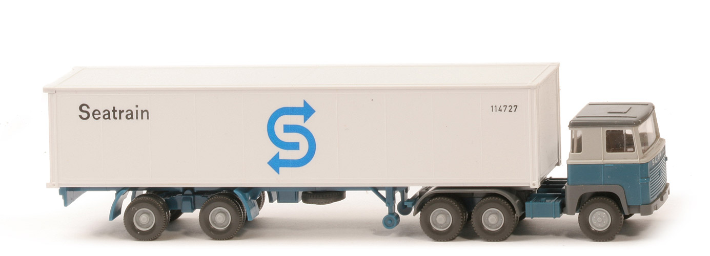 | Zugmaschine | Dach | basaltgrau | Kabine oben | silbergrau | Kabine unten | azurblau | Stoßstange | basaltgrau | Frontbeschriftung | SCANIA breit | hier Farbhinterlegung | azurblau | Grill Prägung | mit 110 | Scheinwerfer | in der Stoßstange gesilbert | Spiegel | ohne | Scheibenwischer | ohne | Lenkrad | ohne | Sattelpfanne | für großen Königsbolzen | Reserverad | unter Chassis | Chassis Farbe | azurblau | Räder | 12mm, Profil grob | Felgen | silbergrau | | Container | Art | 40 ft Glattwand | Dach | altweiß | Korpus | weiß | Türen | neu, weiß | Beschriftung | Seatrain ... (s. Foto) | Pfeile | ca. himmelblau | | Auflieger | Farbe | azurblau | Unterfahrschutz | ohne | Königsbolzen | stark | Räder | 12mm, Profil fein | Felgen | silbergrau |