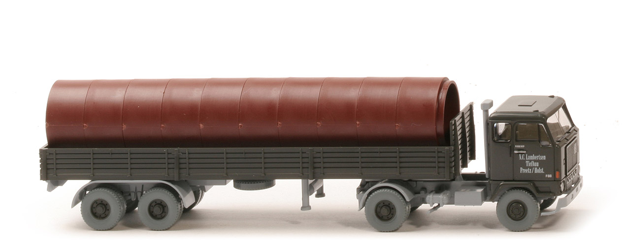 Ein Wiking Volvo F88 Pritschensattelzug, Baujahr ab 1965, zum Transport z.B. von Betonröhren der Firma Niels Christian Lambertsen Tiefbau, Preetz, in umbragrau.".
