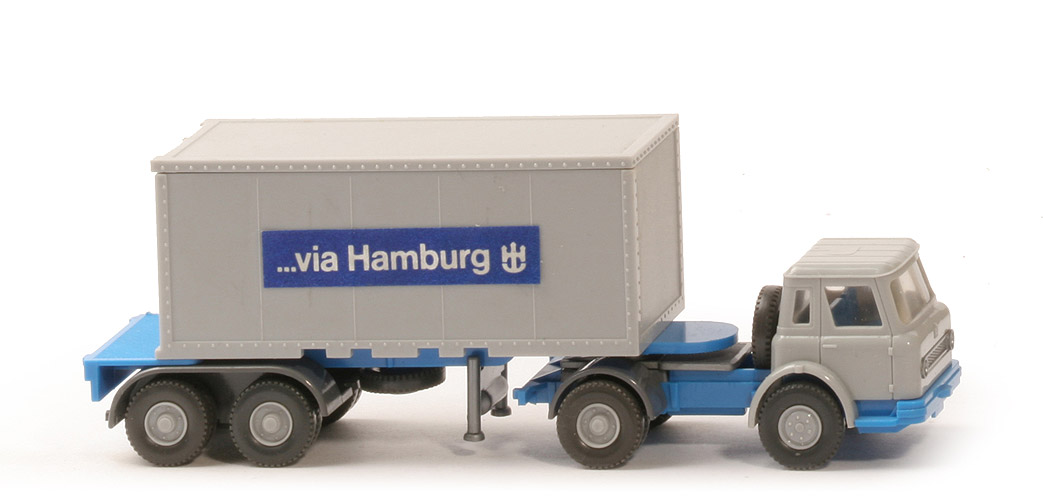 | Zugmaschine | Kabine | silbergrau | Lüfter | mit | Inneneinrichtung | himmelblau | Verglasung | klar | Chassis | himmelblau | Radlauf hinten | basaltgrau | Sattelpfanne | für großen Königsbolzen | Reserverad | hinter Kabine (hier ohne Felgeneinsatz) | Räder | Profil grob | Felgen | silbergrau | | Container | Art | 20 ft Glattwand | Farbe | ca. silbergrau | Türen | alt | Beschriftung Fahrerseite | "Hamburg", Logo | Beschriftung Beifahrerseite | "... via Hamburg", Logo | Beschriftung Art | Papieraufkleber | | Auflieger | Farbe | himmelblau | Variante | ohne Markierung, mit Bohrungen neben KoBo | Reserverad | unter Auflieger, gesteckt | Bodenprägung | 52h | Doppelachsaggregat Farbe | basaltgrau | Doppelachsaggregat Typ | Klemmplatte WIKING u. GERMANY | Hydraulikstützen | silbern, gesteckt | Räder | Profil grob | Felgen | silbergrau |