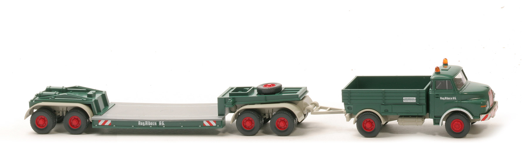 | | Zugmaschine | | Farbe Kabine | ca. diamantgrün mit durchgesteckten Warnlichtern | | Verglasung | klar | | Inneneinrichtung | schwarz, Lkr integriert | | Grill Ausführung | Druck, rot | | hier Beschriftung | MAN, Diesel in silber | | Bedruckung Front | Scheinwerfer, Zierlinien silbern, Warnbake, Blinker | | Bedruckung Türen | "Aug. Alborn KG" | | Chassis | ca. perlweiß | | Kardanelement | ca. perlweiß | | Kotflügel hinten | ca. perlweiß | | Bodenprägung | neues WIKING-Logo, Germany | | Reserverad | ohne | | Sattelpfanne | alt, mit Steg, für großen KöBo, ähnlich | | Pritsche | ca. diamantgrün, in Sattelpfanne gesteckt | | Bedruckung Pritsche | "Güternahverkehr Standort Dortmund" | | Bedruckung Rückleuchten | rot | | | Anhänger | | Aufbau | ca. diamantgrün | | Drehschemel | ca. perlweiß | | Pritscheneinlage | silbern ohne Dorn | | DAA Typ | Klipsachsen, Kotflügel rund | | DAA Farbe | ca. perlweiß | | Deichsel | ca. perlweiß | | Reserverad | über Drehschemel | | Bodenprägung Aufbau | 503, neues WIKING-Logo | | Rückleuchten | am Aufbau, rot bedruckt | | Bedruckung | Warnbaken, "Aug. Alborn KG" | | | Räder | | Typ | 12 mm, Felgen eingesetzt | | Felgen | 8-Loch, rot |