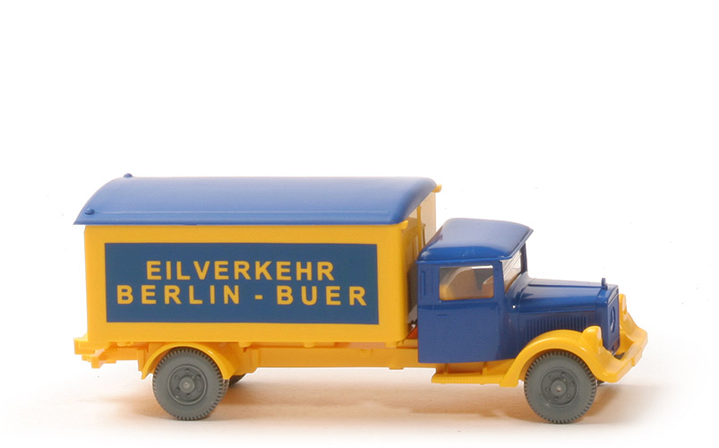 Kabine | dunkelultramarin | Dach | dunkelultramarin | Verglasung | klar | Inneneinrichtung | gelb, Lkr integriert | Grill | dunkelultramarin, mit Stern, mit senkrechten Streben | Chassis Farbe | gelb | Kardaneinsatz Farbe | gelb | Kardaneinsatz Bodenprägung | neues WIKING-Logo, Germany | Zughaken | ohne | Reserverad | eingespart (ohne) | Kotflügel hinten | gelb | Koffer Farbe | gelb | Koffer | Typ 4 | Rückleuchten | neu | Positionslichter vorn | mit | Türaufnahmen | unten geschlossen | Türen Farbe | gelb | Dach | glatt, mit Rand und Positionsleuchten | Dach Farbe | dunkelultramarin | Nummerschild | an der Stoßstange | Beschriftung | Eilverkehr Berlin - Buer ... (s.Foto) | Beschriftung Art | Negativdruck dunkelultramarin | Räder Typ | 11mm, 6-Loch, einteilig | Räder Farbe | ca. staubgrau |