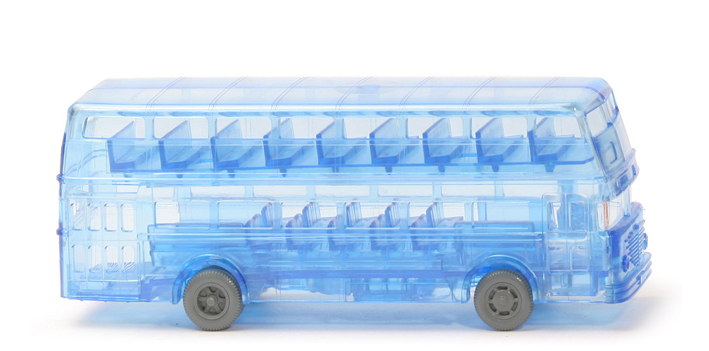 | Karosserie Farbe | transparent, leicht blau | | Karosserie Typ | Einstieg hinten geschlossen | | Verglasung | klar | | Fahrer Farbe | transparent, leicht blau | | Fahrer Typ | Standardbusfahrer | | Fahrer Bemalung | Gesicht, Hände | | Lenkrad | separat, transparent, leicht blau | | Sitze Farbe | transparent, leicht blau | | hintere Fahrgastraumbegrenzung | ohne | | Treppe hinten | ohne | | Chassis Farbe | transparent, leicht blau | | Kardanelement Farbe | transparent, leicht blau | | Version Chassis | ohne kreisrunde Verstärkung | | Bodenprägung | neues WIKING-Logo, WM | | Werbebeschriftung | ohne | | Zielbeschriftung vorne | ohne | | Stadtwappen | ohne | | weitere Bedruckung | ohne | | Räder Typ | 12 mm, alte Bus-Räder Trilex | | Räder Farbe | ca. staubgrau |