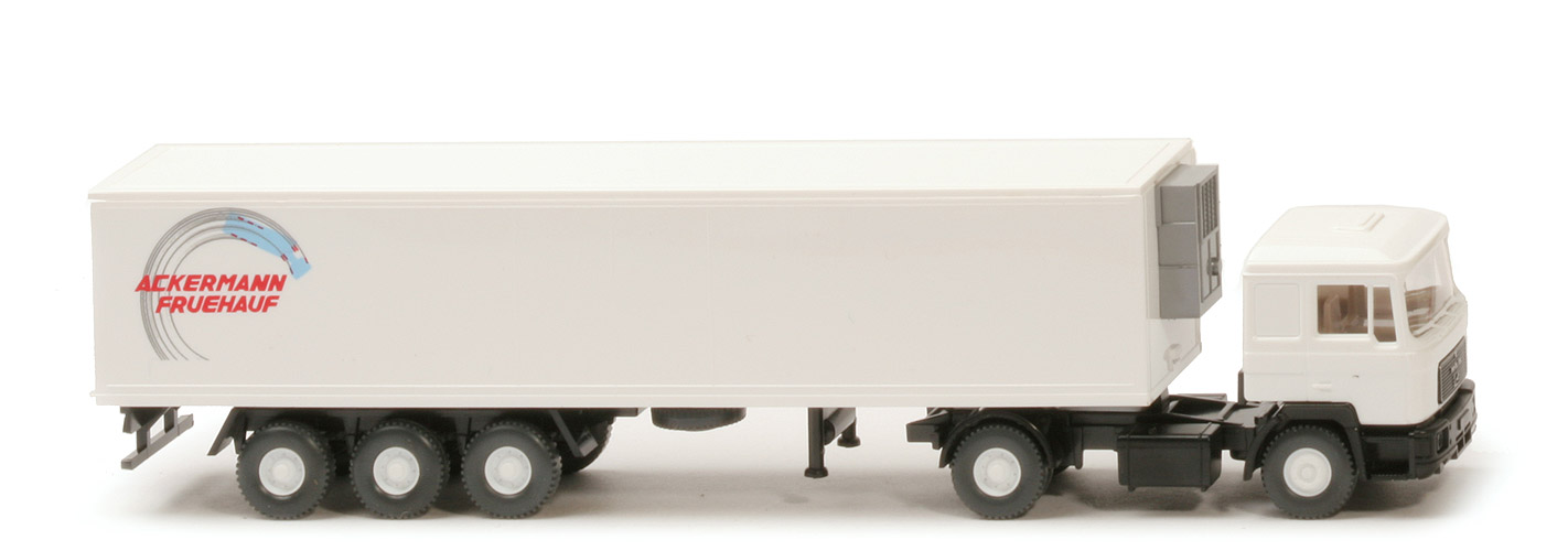 | Zugmaschine | Kabine | weiß | eingesetzter Grill | schwarz | Bedruckung Grill | Rand, MAN-Logo, Löwe silbern | Inneneinrichtung | ca. graubeige, Lkr integriert | Kabinenunterbau | schwarz | Stoßstange, Kotflügel | schwarz | Chassis | schwarz | Kardaneinsatz | schwarz, Bodenprägung neues WIKING-Logo, Germany | Radlauf hinten | schwarz | Reserverad | unter Chassis | Räder | Profil grob | Felgen | 8-Loch, weiß | | Auflieger | Farbe Dach | weiß | Farbe Korpus | weiß | Türen | weiß | Beschriftung | Ackernmann/ Fruehauf ... (s. Foto) | Beschriftung Art | Druck | Chassis | schwarz | 3-Achsaggregat Farbe | schwarz | Unterfahrschutz | mit | Königsbolzen | stark | Räder | Profil grob | Felgen | 8-Loch, weiß |