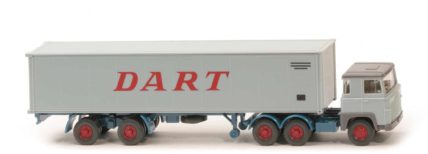| Zugmaschine | Dach | basaltgrau | Kabine oben | hellblaugrau | Kabine unten | hellblaugrau | Stoßstange | basaltgrau | Scheinwerfer | 2, ungesilbert | Spiegel | mit | Scheibenwischer | ohne | Lenkrad | mit | hinterer Radlauf | azurblau | Sattelpfanne | für großen Königsbolzen | Reserverad | ohne | Chassis Farbe | azurblau | Räder | 12mm, Profil grob | Felgen | hellbraunrot | | Container | Art | 40 ft Glattwand | Dach | hellblaugrau | Korpus | hellblaugrau | Türen | neu, hellblaugrau | Beschriftung | DART ... (s. Foto) | | Auflieger | Farbe | azurblau | Unterfahrschutz | ohne | Königsbolzen | stark | Räder | 12mm, Profil grob | Felgen | hellbraunrot |