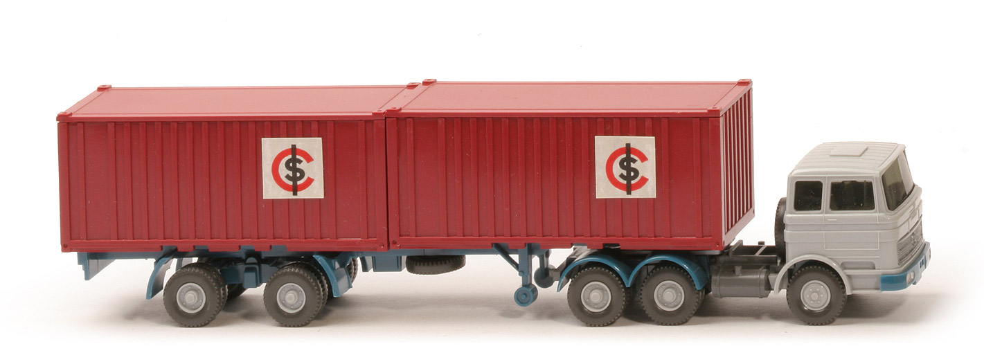 | Zugmaschine | Typ | Dach längsversteift | Kabine | silbergrau | Spiegel | ohne | Lenkrad | ohne | Scheibenwischer | ohne | Inneneinrichtung | ca. hellgelbgrau | Stoßstange | azurblau, Scheinwerfer gesilbert | Chassis | basaltgrau, ohne Zentriernippel | Radlauf hinten | zweiteilig azurblau | Reserverad | hinter Kabine | Räder | Profil grob | Felgen | silbergrau | | Container | Art | 2 x 20 ft Stahlcontainer mit Aussparung | Farbe | rubinrot | Türen | für Stahlcontainer | Beschriftung | Papieraufkleber "ICS" 12 mm | | Auflieger | Farbe | azurblau | Unterfahrschutz | ohne | Königsbolzen | stark | Räder | Profil grob | Felgen | silbergrau |
