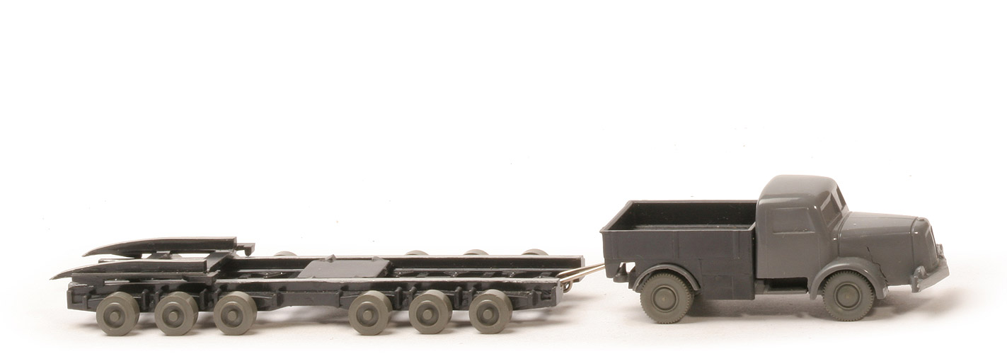 Achsen | Rollachser | | Zugmaschine | Farbe Kabine | basaltgrau | Farbe Chassis | basaltgrau | Bemalung | Scheinwerfer, Stoßstange | Sattelpfanne | ohne | Chassis | Version 1a | Achshalterungen | geschlossen | Bodenprägung | WM ohne Kreis | Reserverad | ohne | Pritsche | anthrazit | Ladegut | ohne (nur ohne original) | Räder | neuere Version | | Anhänger Culemeyer | Typ | Gleiskante hoch | Bodenprägung | nur WMiK | Farbe | anthrazit | Bremsplatte | anthrazit, glatt, Höhe 1,4mm | Rampe | anthrazit | Bemalung | Gleise silbern | Deichsel | Metall | Räder | Walzenräder 7,8mm o. Profil | Farbe Räder | staubgrau |